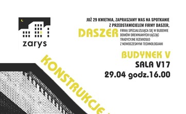 Koło Architektoniczne ZARYS zaprasza wszystkich studentów i pracowników uczelni na spotkanie z przedstawicielem firmy Daszer, które odbędzie się 29.04.2025 r. (wtorek) o godzinie 16:00 w sali V.17.